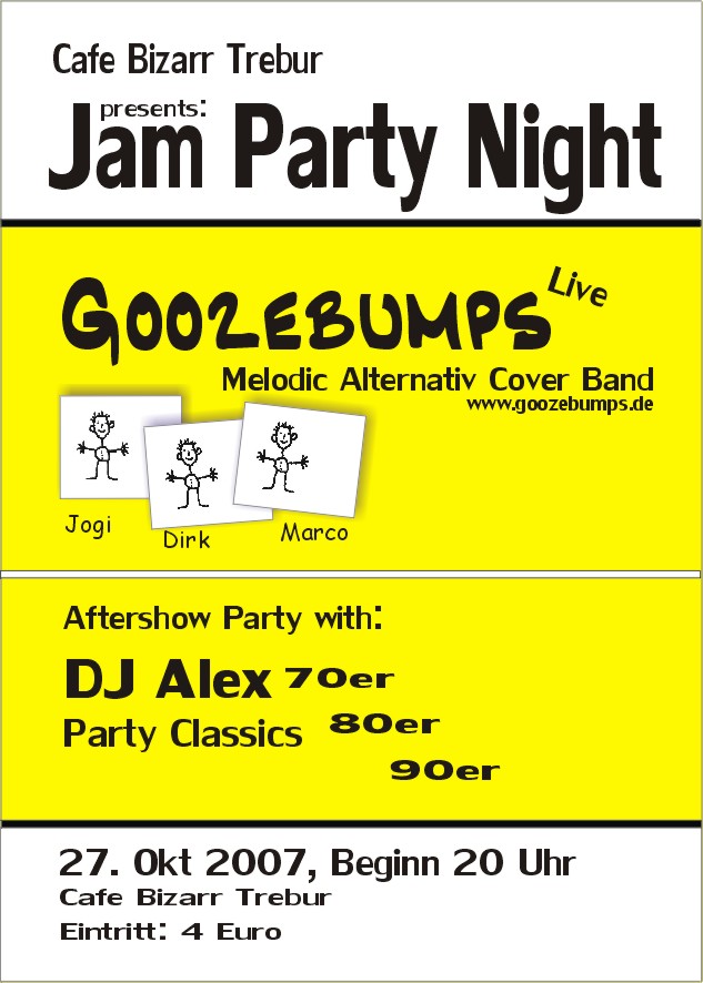 Das Band Trio Joachim Boch, Dirk Beckschäfer und Marco Küchler spielt am 27.Oktober 2007 im Cafe Bizarr Trebur und startet somit die erste Jam Party Night.